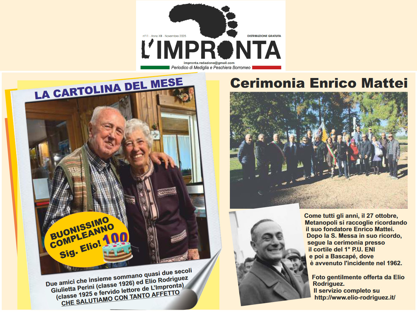 da "L'Impronta" del Novembre 2025 Festa dell'Unità Nazionale e delle Forze Armate. San Donato Milanese (4 Novembre 2025) Commemorazione dei defunti, chiesa di San Donato V.M. (2 Novembre 2025) San Donato Milanese, Città giardino - Scorci del presente e del passato - 1 novembre 2025  Commemorazione di Enrico MATTEI nel 63° anno della scomparsa (27 ottobre 2025)  ALPINI : Festa per il 91° compleanno di Michele DEL TOGNO
