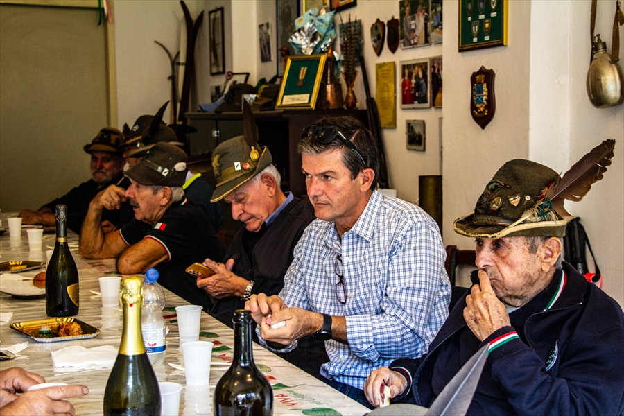 ALPINI : Festa per il 91° compleanno di Michelone. 11 ottobre 2025. In attesa della torta i Veci Alpini si trastullano come possono.