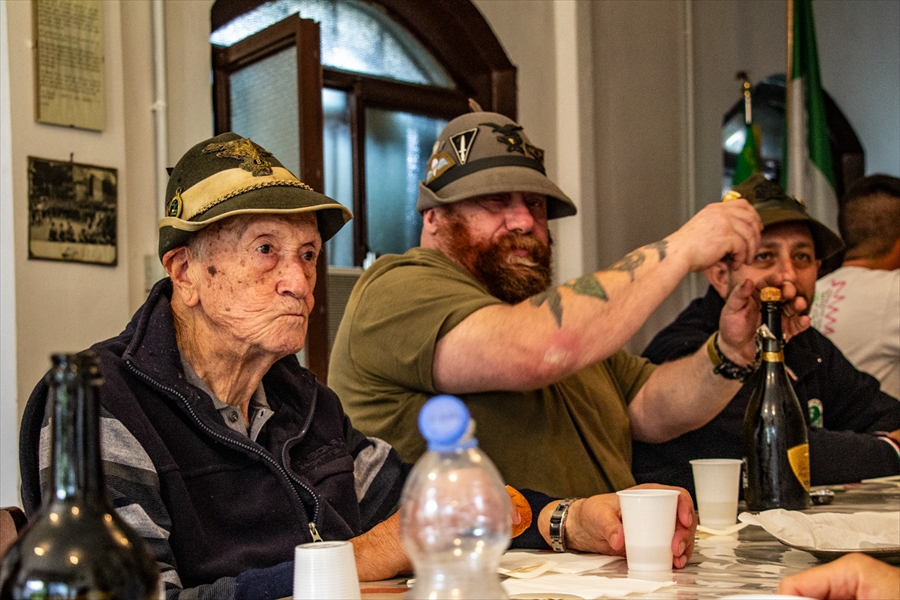 ALPINI : Festa per il 91° compleanno di Michelone. 11 ottobre 2025. In attesa della torta i Veci Alpini si trastullano come possono. Fabio PONTI ....tira il collo a un'altra bottiglia di prosecco.