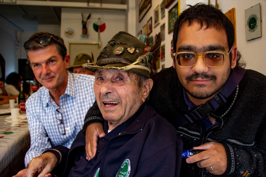ALPINI : Festa per il 91° compleanno di Michelone. 11 ottobre 2025. Il bocia Luigi vuole una foto ricordo col Vecio Michelone.