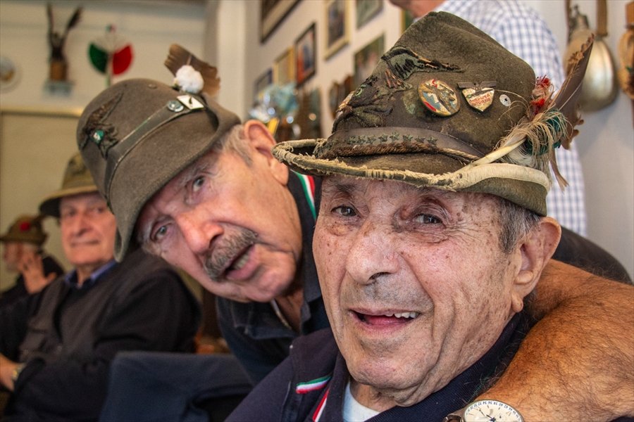 ALPINI : Festa per il 91° compleanno di Michelone. 11 ottobre 2025. L'attesa è infinita ma la pazienza è la virtù dei forti. Guido abbraccia Michelone come un boa constrictor ma Lui sorride.