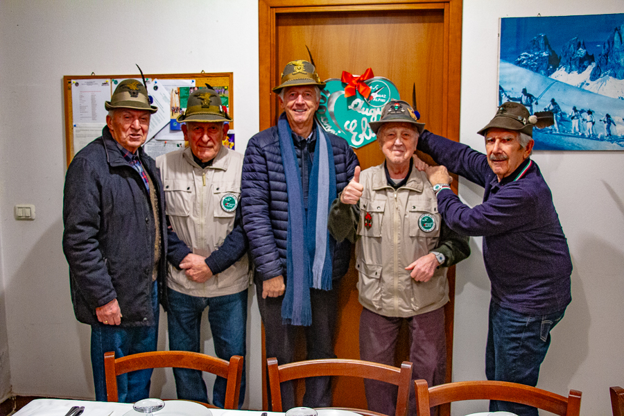 ALPINI 100° compleanno di Elio RODRIGUEZ 4 dicembre 2025 Carlo PRINA, Pietro CURDO, Gianni DEGHETTO, Elio RODRIGUEZ e Guido RADAELLI.