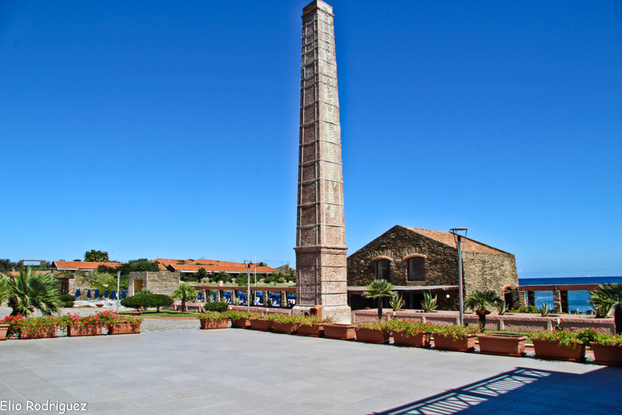 2017-09-14 - STINTINO ( SS ) - Uno scorcio del complesso turistico de " LE TONNARE " : la grande ciminiera quadrata e sullo sfondo la zona spiaggia e annesso bar con vista mare.
