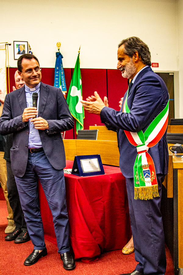 CIVICI RICONOSCIMENTI - BENEMERENZE - SAN DONATO MILANESE - Sabato 20 settembre 2025 - Sala Consiliare del Comune - Don Umberto BORDONI accoglie e gradisce l'applauso del Sindaco Francesco SQUERI.